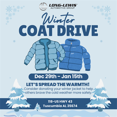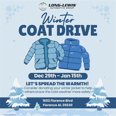 From December 29 – January 15, join the 2026 Winter Coat Drive by donating your gently used coats at any North Alabama Long-Lewis location.